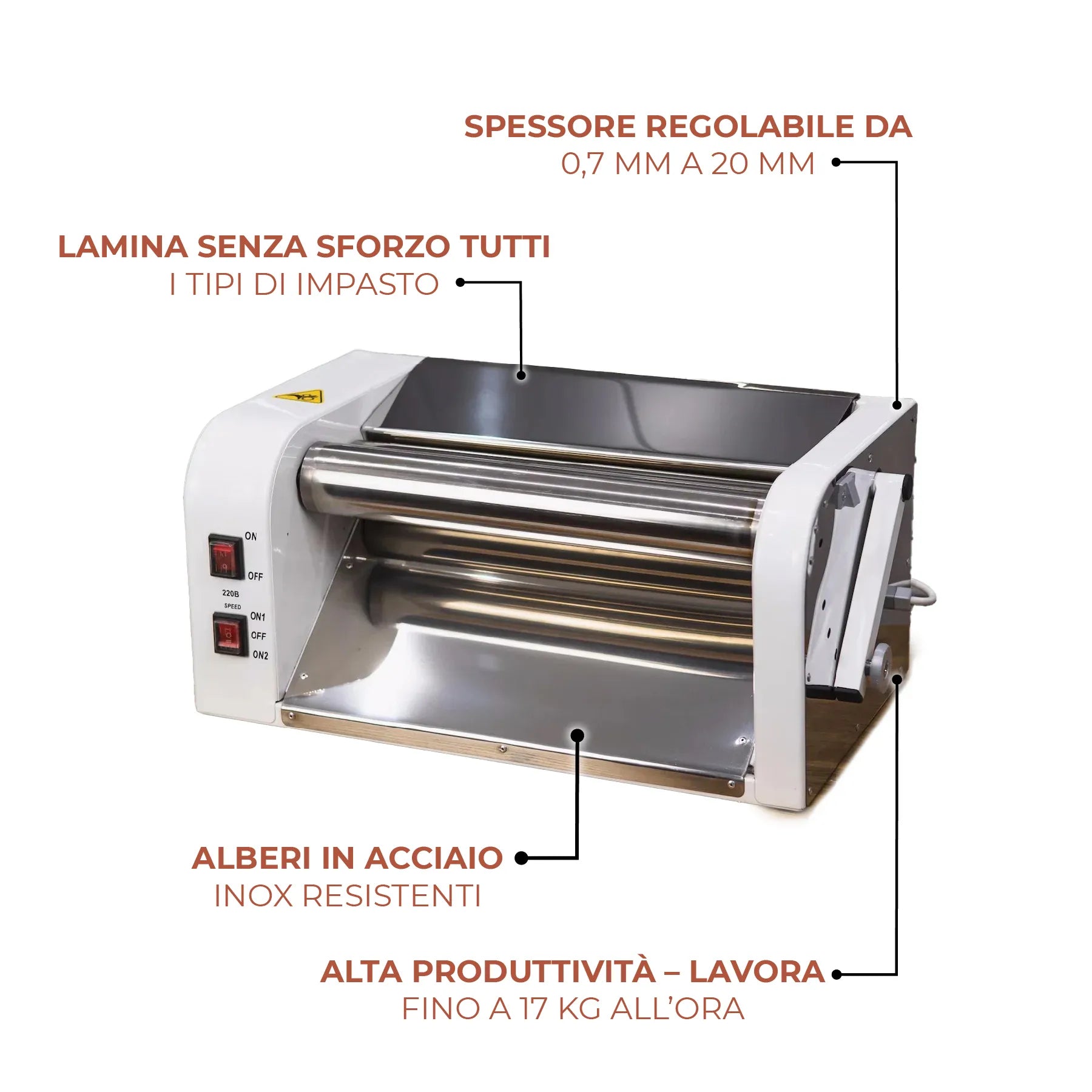 È possibile regolare la distanza tra i rulli da 0,7 mm a 20 mm, consentendo sia sfoglie ultra sottili sia impasti più spessi per pane, pizza o prodotti laminati.